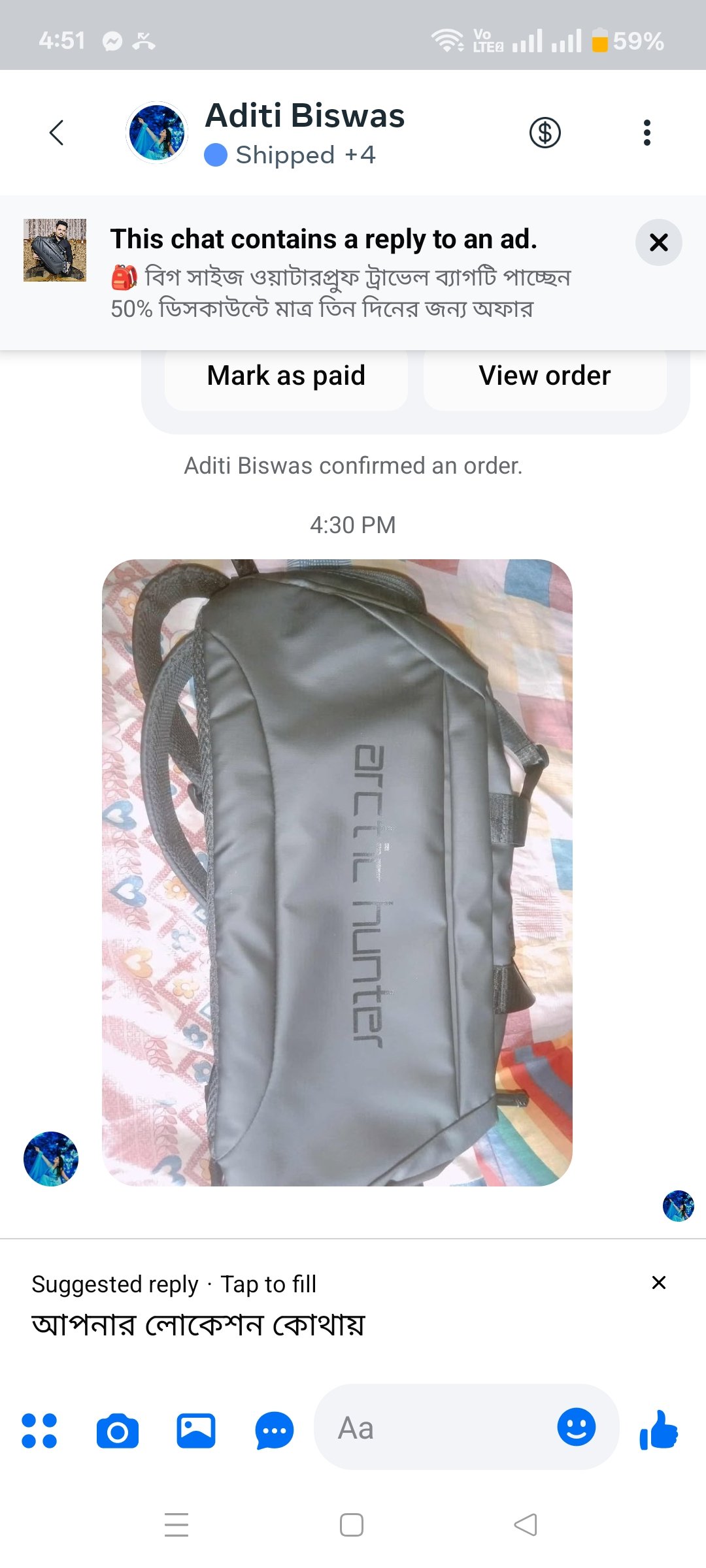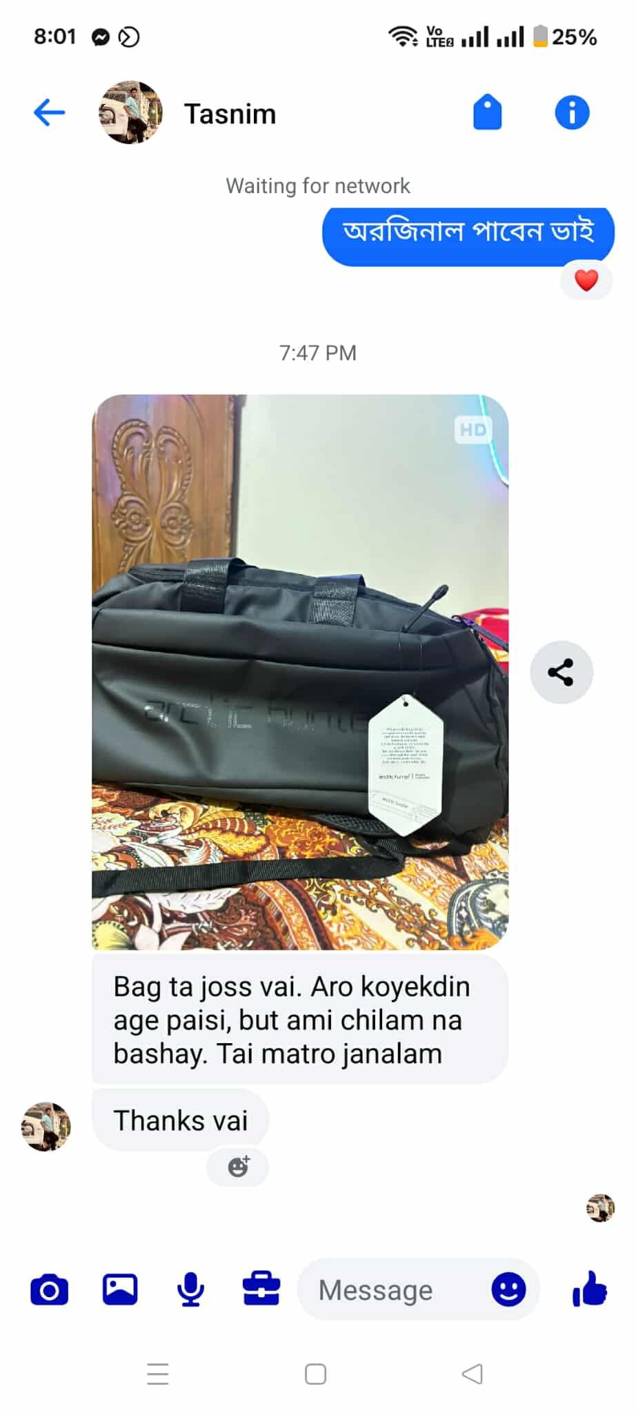 ব্যাগটি হাই কোয়ালিটি ওয়াটারপ্রুফ ম্যাটেরিয়াল দিয়ে তৈরি তাই অনেক বেশী টেকসই এবং পানিরোধী।